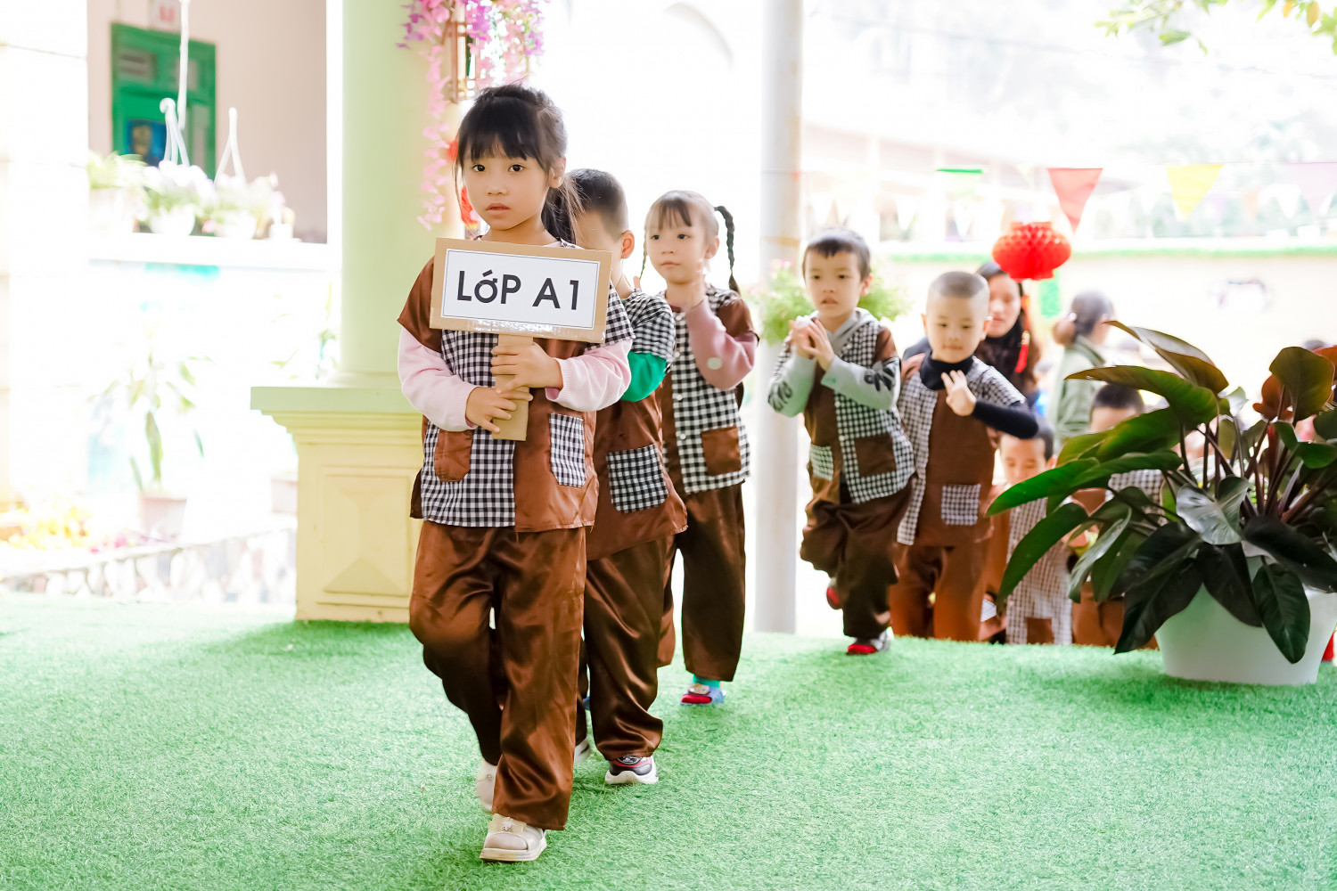 Các bé lớp 2 tuổi D1 mạnh dạn tự tin đi diễu hành qua sân khấu với trang phục tự chọn