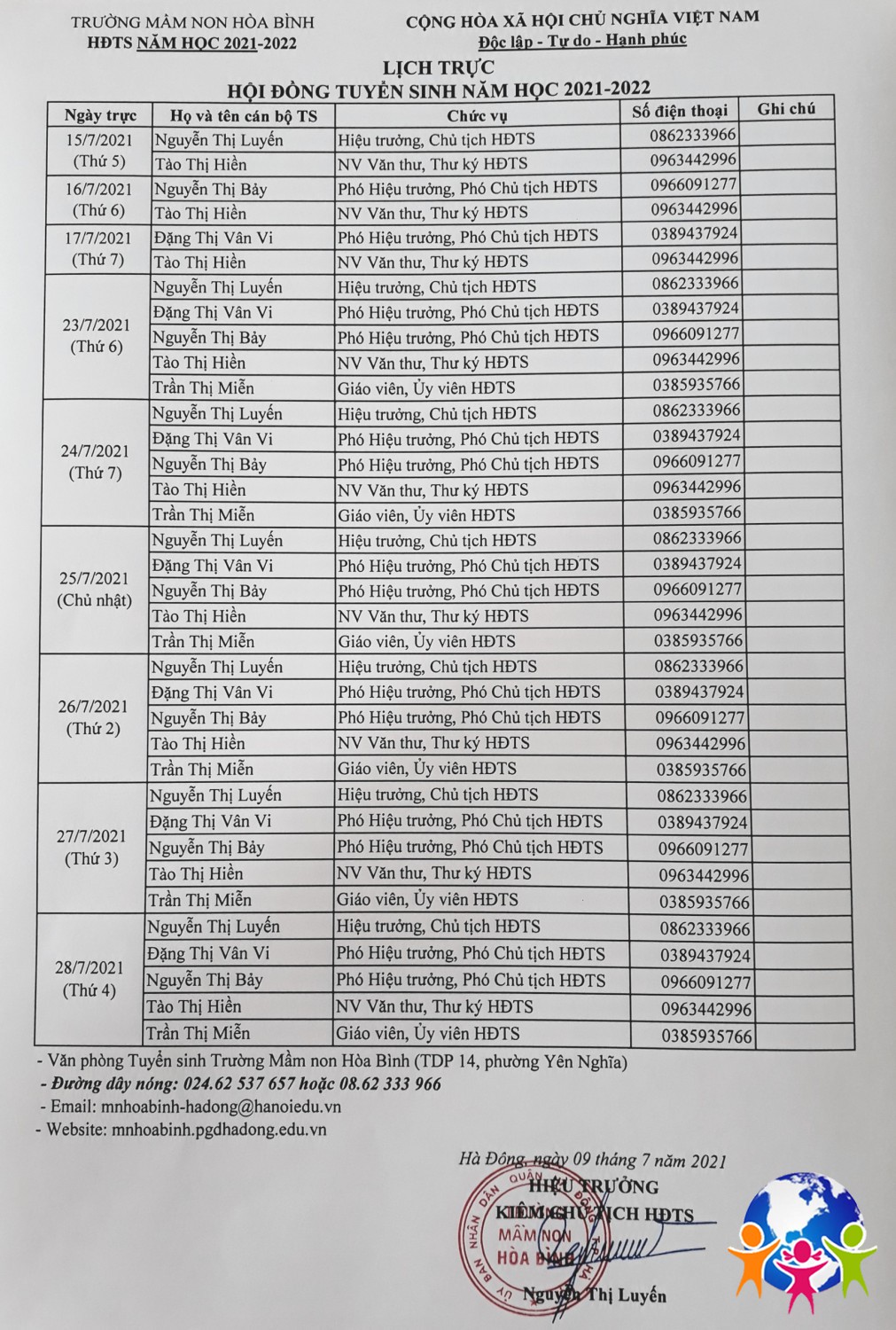 Thông báo:Lịch trực Hội đồng tuyển sinh năm học 2021-2022